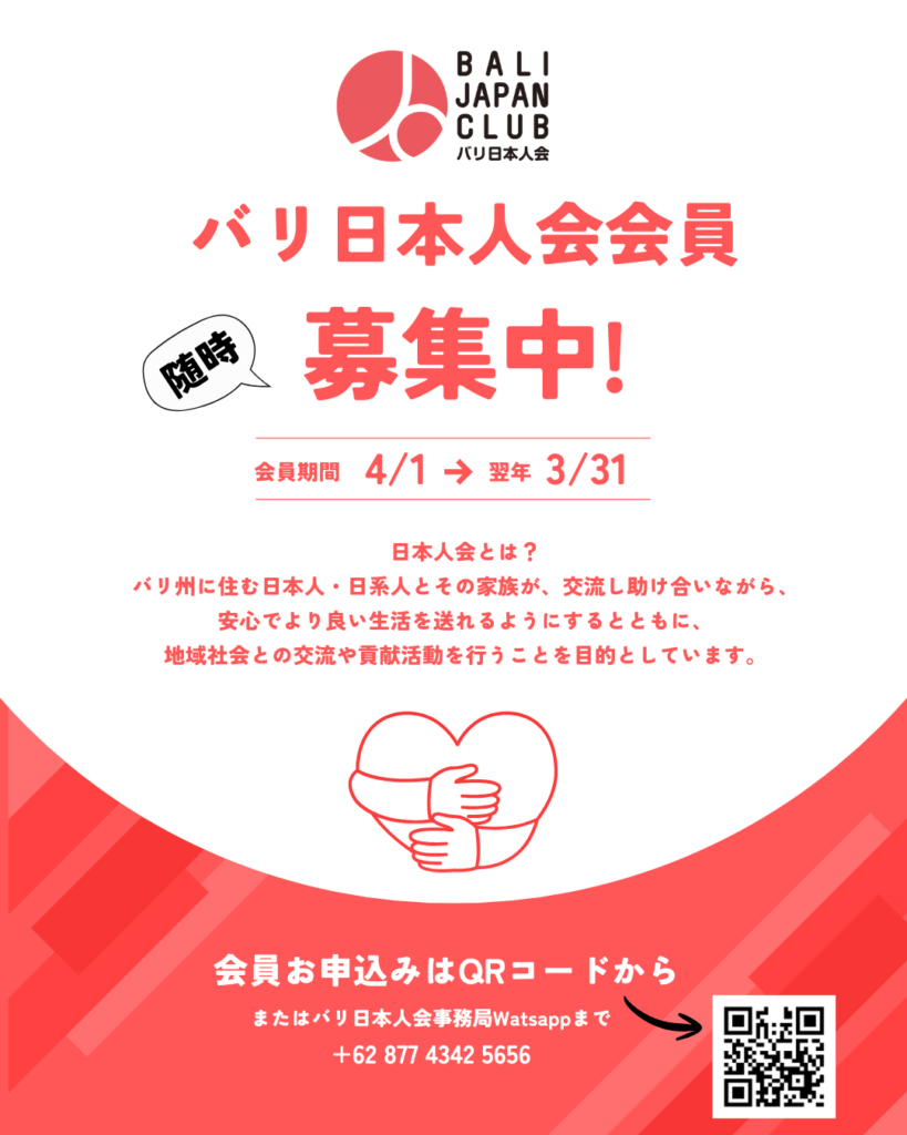 バリ日本人とは? バリ州に住む日本人・日系人とその家族が、交流し助け合いながら、安心でより良い生活を送れるようにするとともに、地域社会との交流(盆踊りや弁論大会開催等)や貢献活動(養護施設や災害時の寄付等)を行うことを目的としています。